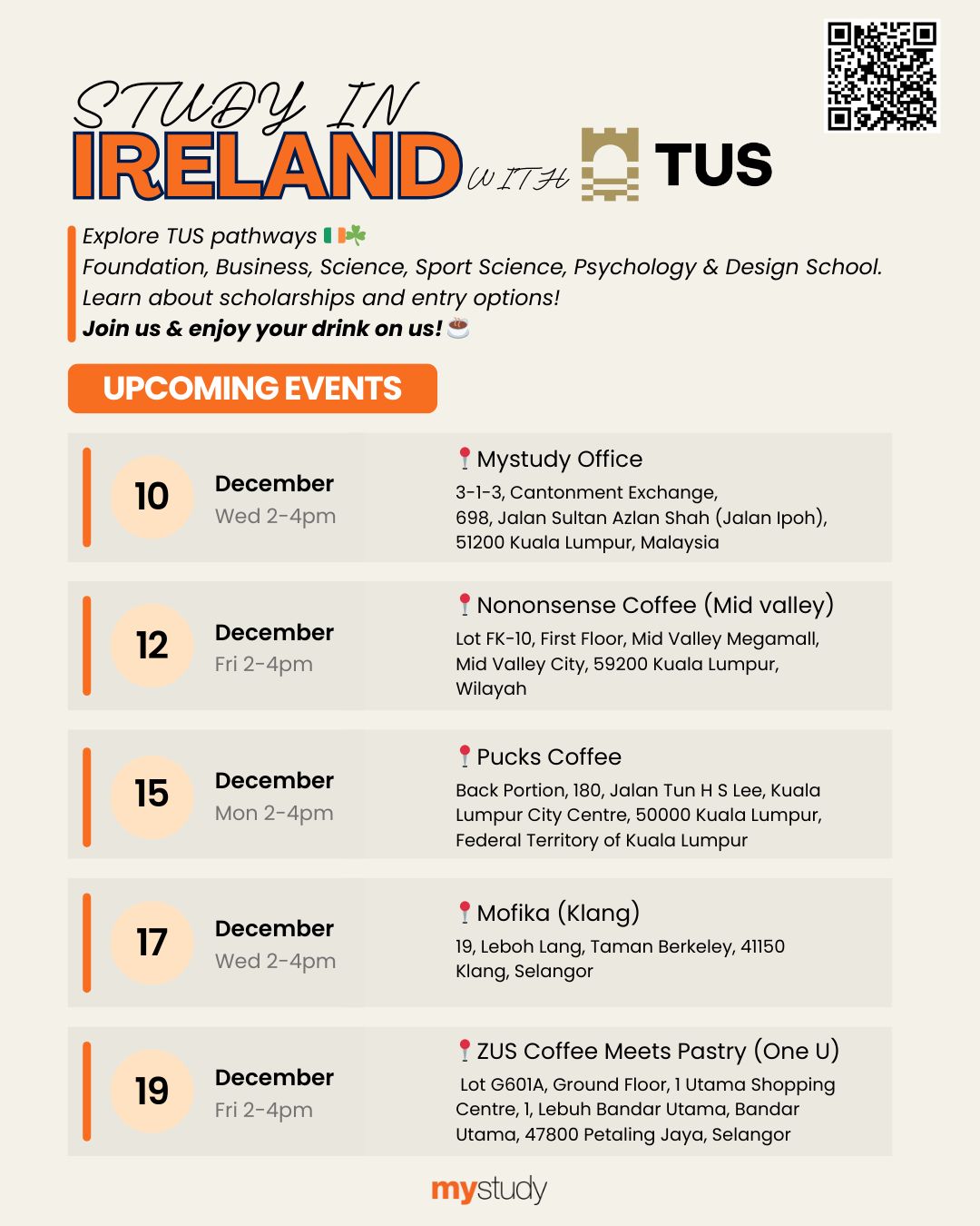 17/12 - Mofika (Klang), 19/12 - ZUS Coffee meets Pastry (1U)